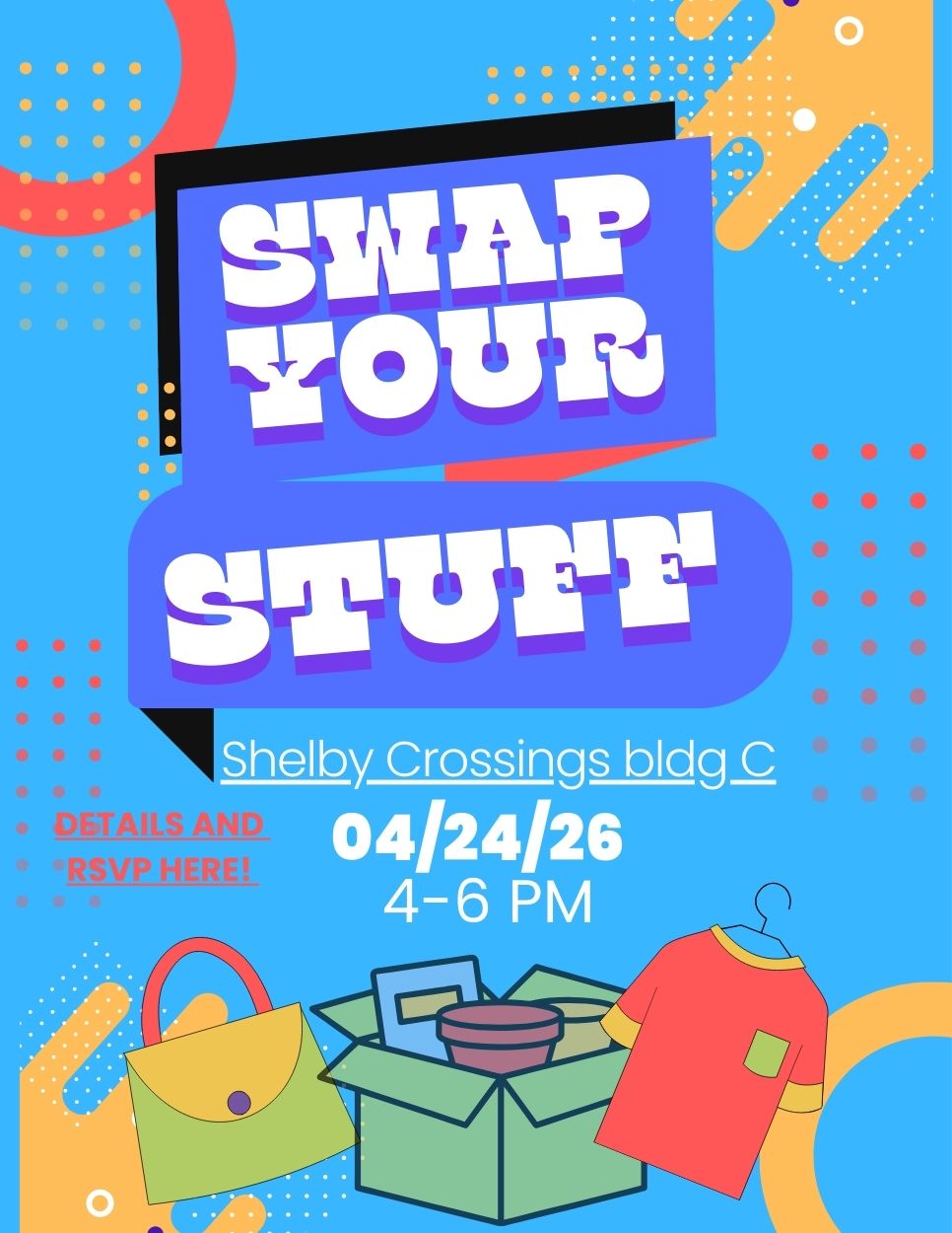 If you're setting up items to give away, please be ready by 3:30. Books, toys, clothes, etc. are all great to bring!