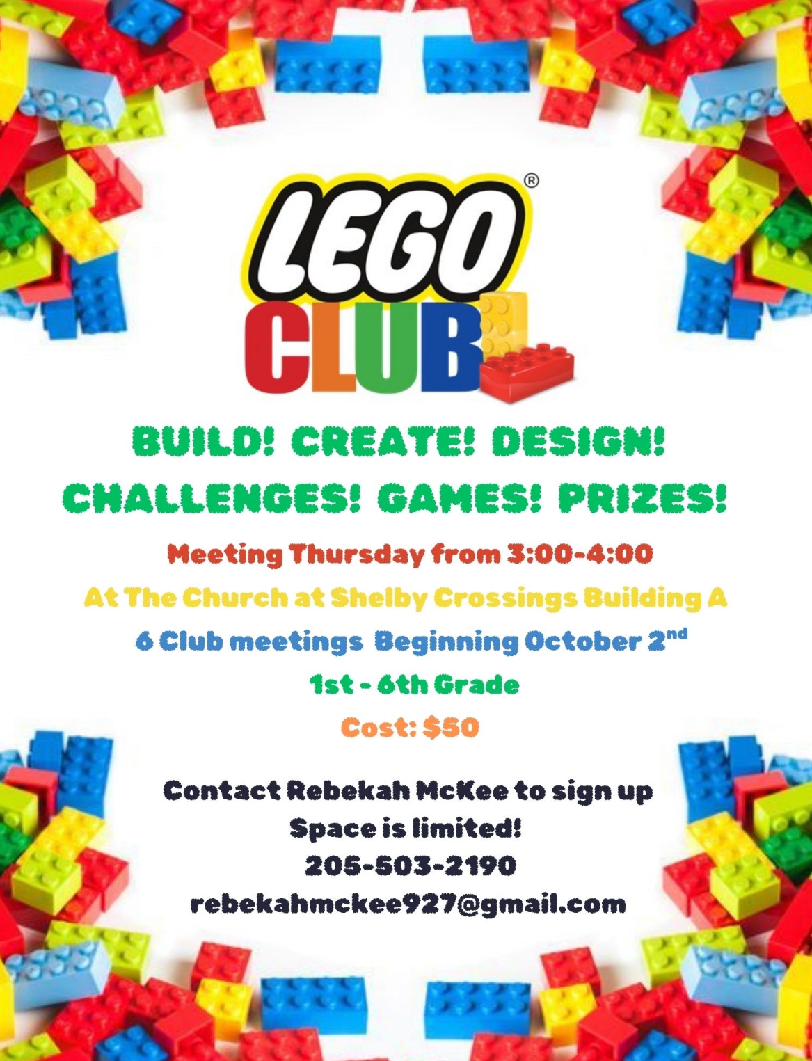 Register now to join our Lego Club meetings for the fall. Students will gather in bldg A to work on projects and design together with fun challenges given to them by experienced teacher and mom Rebekah McKee. Cost is $50 for 6 meetings starting October 2. Perfect for 1st-6th graders.